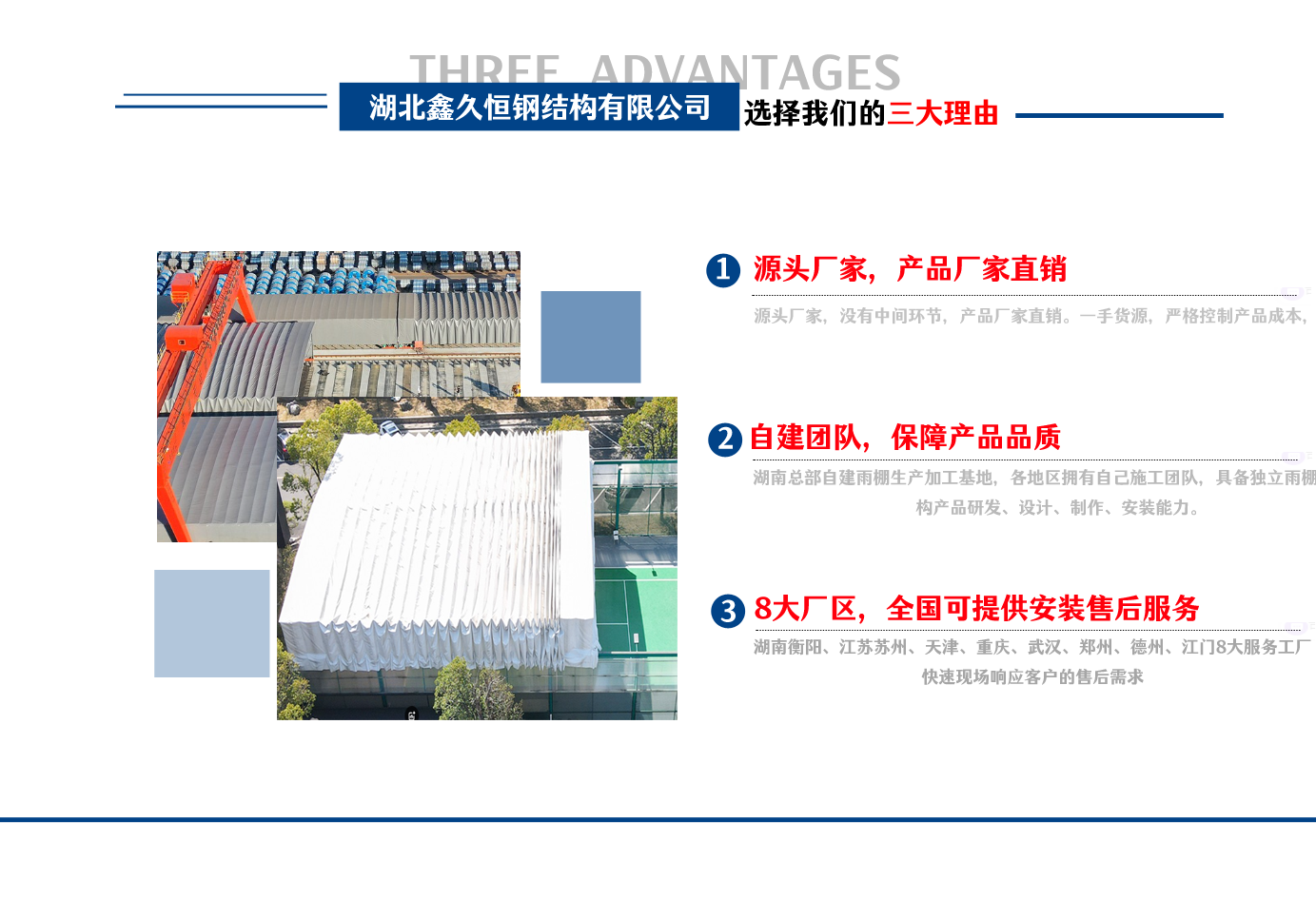 湖北鑫久恒鋼結(jié)構(gòu)有限公司是一家電動雨棚、膜結(jié)構(gòu)車棚研發(fā),生產(chǎn)銷售,施工安裝于一體的專業(yè)鋼結(jié)構(gòu)科技公司,主要產(chǎn)品有伸縮雨棚,電動雨棚,膜結(jié)構(gòu)車棚等。 湖南地區(qū)職員目前有80多人,占地面積20000平方米,廠房面積15600平方米,配備先進(jìn)的生產(chǎn)流水線,使每件品質(zhì)產(chǎn)品的堅實基礎(chǔ)。 公司在蘇州、天津、重慶、武漢、德州、烏魯木齊、江門均設(shè)有服務(wù)工廠,總?cè)藛T共300多人,擁有專業(yè)的技術(shù)團隊,配備先進(jìn)的設(shè)備和流水線生產(chǎn),產(chǎn)能高,貨源充足,發(fā)貨速度快,服務(wù)區(qū)域廣。 移動伸縮棚適用于通道臨時倉儲、戶外運動遮陽、污水池遮蓋、能源交通、熱力化工、礦山、船舶制造及市政建設(shè)、物流、碼頭等領(lǐng)域的構(gòu)件制作加工,成品半成品存放、倉庫、野外儀器設(shè)備操作用房等。尤其是對工廠發(fā)貨、倉儲臨時遮雨防嗮,梅雨期較長、建設(shè)周期較短的工程施工等特別適用。還可根據(jù)用戶需求量身定制、適合企業(yè)所需不同款式的產(chǎn)品。 我公司堅持“誠信社會為本,客戶滿意為榮”的經(jīng)營理念,做到質(zhì)量把控,嚴(yán)格管理,精益求精,恪守承諾。使鑫久恒逐步走向成熟,其系統(tǒng)化、專業(yè)化日趨完善。以專業(yè)的技術(shù)、科學(xué)的管理,更高的產(chǎn)品質(zhì)量,優(yōu)良的企業(yè)信譽,真誠的客戶服務(wù),靈活多樣的經(jīng)營方式和務(wù)實創(chuàng)新的企業(yè)精神愿與社會各界攜手合作,為推動智能鋼結(jié)構(gòu)建筑事業(yè)的發(fā)展而不斷努力。...